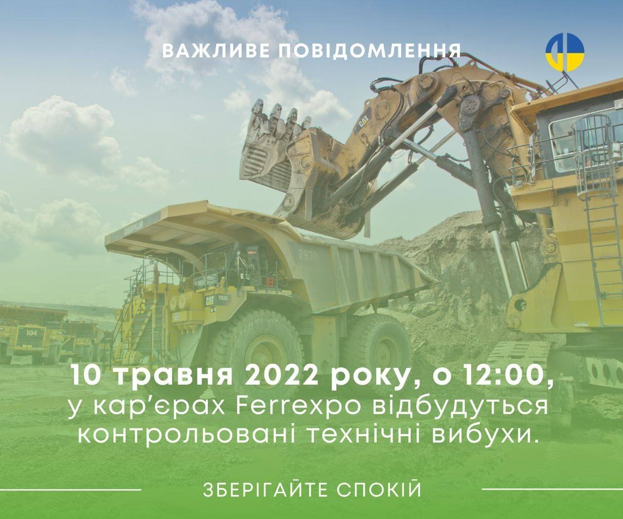 – Важливе повідомлення! 10 травня 2022 року о 12.00, у кар’єрах Ferrexpo відбудуться контрольовані технічні вибухи. Зберігайте спокій!, – йдеться в повідомленні адміністрації компанії.