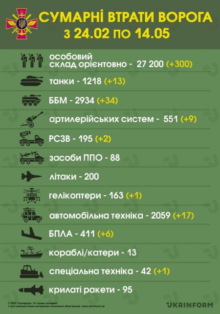 Українські захисники з 24 лютого по 14 травня ліквідували близько 27 тисяч 200 (+300) російських військових, повідомляє Генеральний штаб Збройних сил України