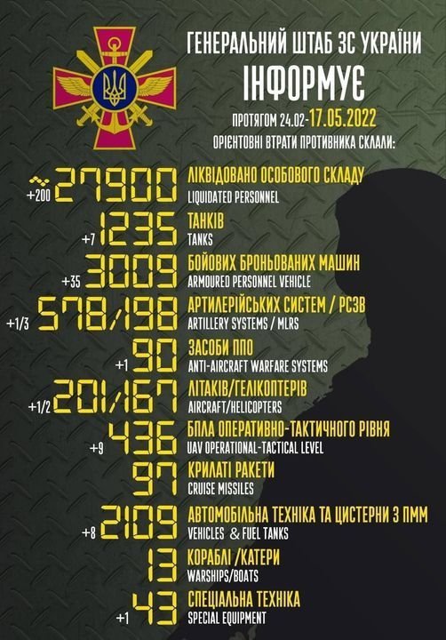 Загальні бойові втрати противника з 24 лютого по 17 травня орієнтовно склали