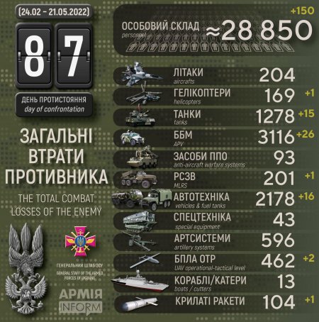 Загальні бойові втрати противника з 24 лютого по 21 травня орієнтовно склали: