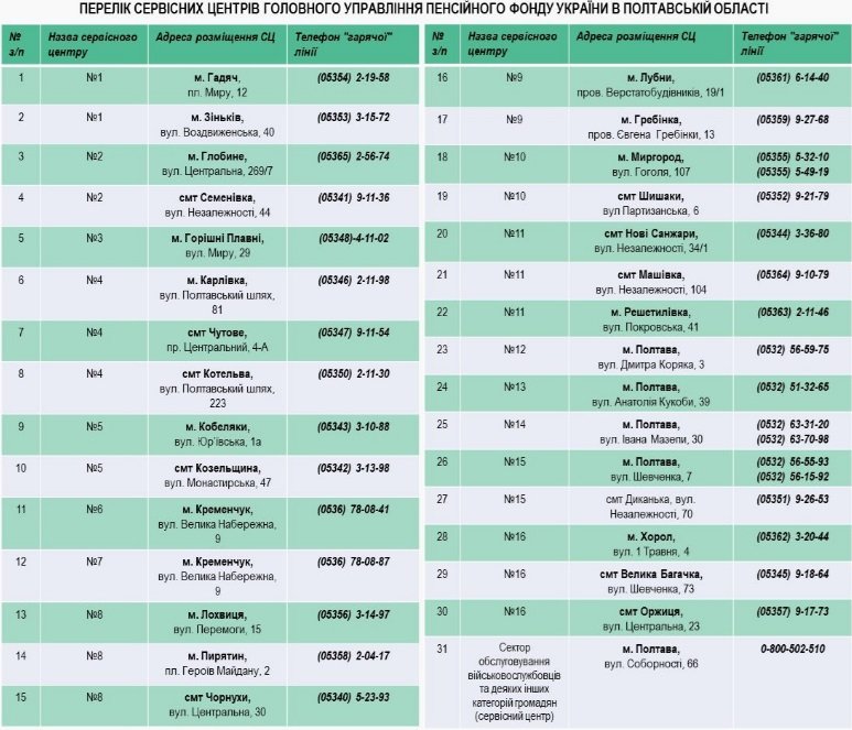 У зв’язку зі змінами номерів гарячих телефонних ліній Головне управління Пенсійного фонду України в Полтавській області оновило інформацію щодо роботи сервісних центрів. Актуальна контактна інформація – в інфографіці.