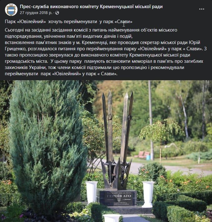 Зауважимо, що питання про перейменування парку «Ювілейний» підіймалося не один рік. Так у грудні 2018 року на засіданні комісії з питань найменування об’єктів , увіковічення пам’яті рекомендували перейменувати парк «Ювілейний» у парк «Слави».