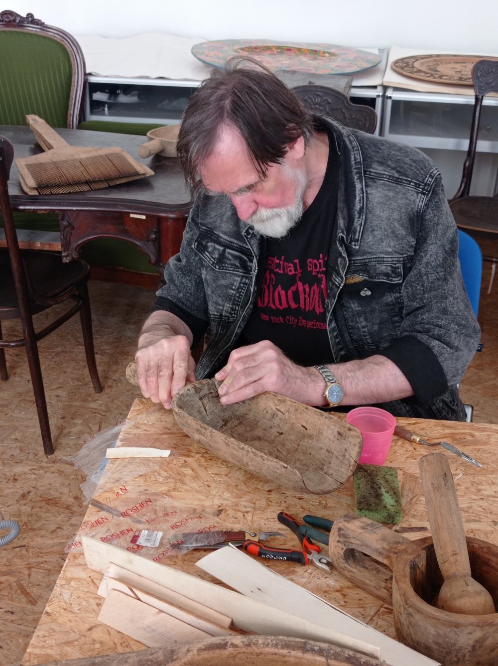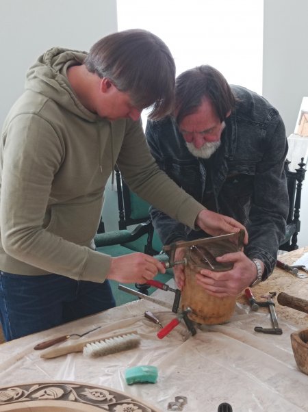 - Керуючись золотим принципом «не зашкодити», реставратори-чарівники обережно очищають дерев’яні ночви, салотовки, ковші, коромисла, ложки, тарелі, вигадливі завитки меблів від багаторічних нашарувань пилу і забруднень. Спеціальними інструментами поступово, по міліметру, випрямляють деформації дерева. Почаклувавши над якимись особливими розчинами, ледь вловимими рухами ніби стирають з дерев’яних поверхонь окремі тріщини і дрібні сколювання. А вже потім предмет консервують – покривають захисним лаком.