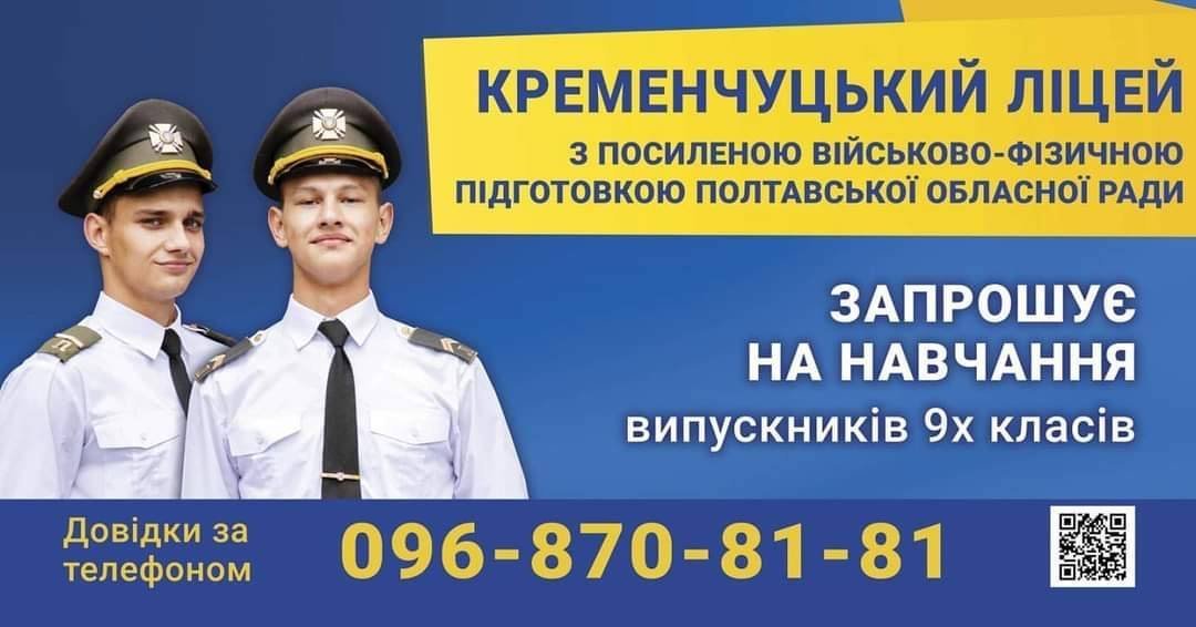 Кременчуцький ліцей з посиленою військово-фізичною підготовкою Полтавської обласної ради продовжує набір на навчання вступників (юнаків) 9-х класів.