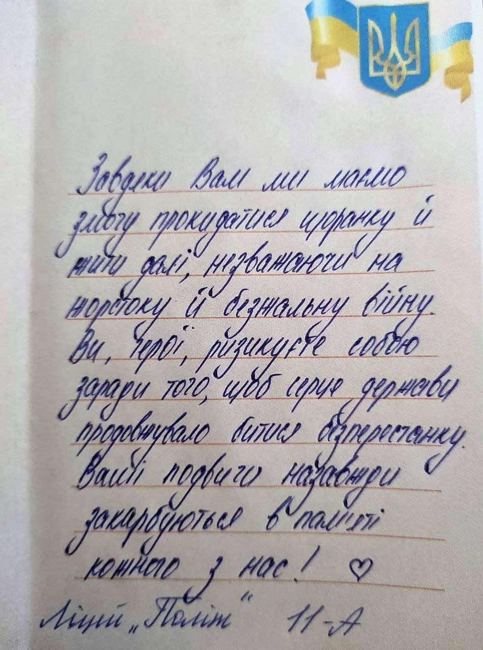 Випускники групи Л-11А наукового ліцею «Політ» при Кременчуцькому педагогічному коледжі ім. А.С.Макаренка зробили подарунок українським воїнам. Під керівництвом класного керівника Валентини Верещаки учні вирішили допомогти нашій армії, нашим хоробрим і мужнім хлопцям, які кожного дня стоять на захисті нашої держави.