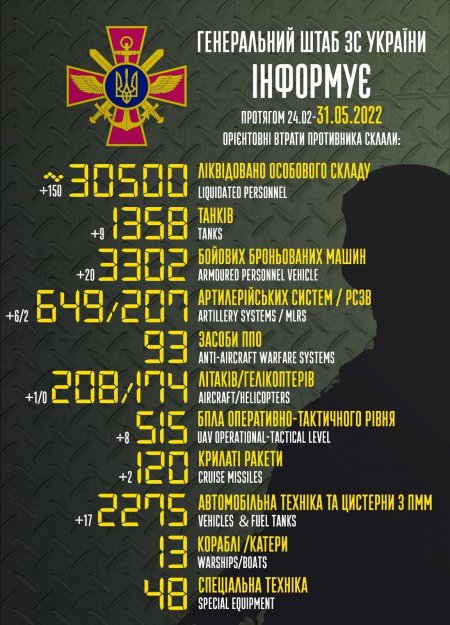 Загальні бойові втрати противника з 24.02 по 31.05 орієнтовно склали:
