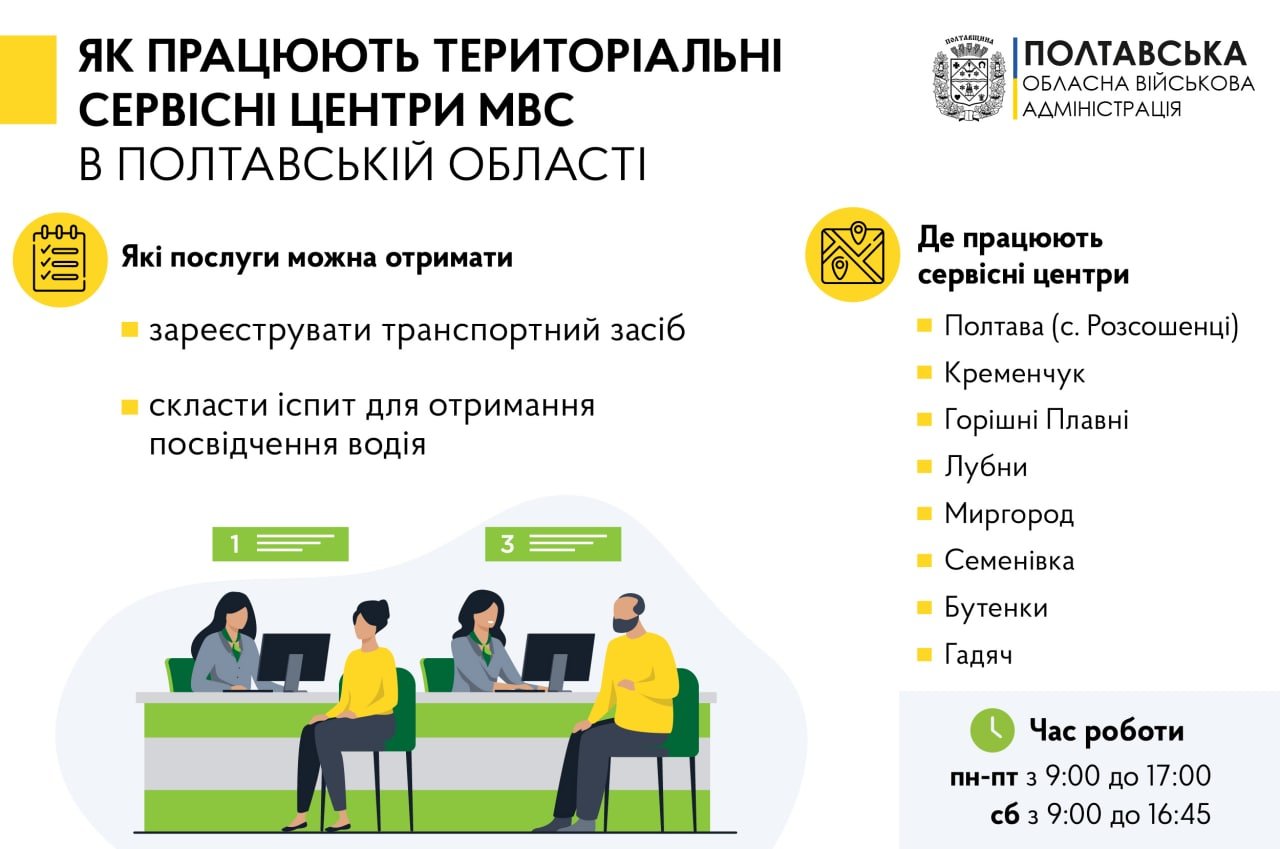 8 сервісних центрів МВС у Полтавській області працюють у звичайному режимі. Про це повідомляє начальник Полтавської обласної військової адміністрації у своєму Телеграм-каналі.