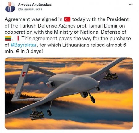 За інформацією міністра національної оборони Литви Арвідаса Анушаускаса, на покупку безпілотника для України прості жителі Литви зібрали 6 мільйонів євро за 3 дні.