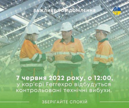 Вибухи на кар’єрах Ferrexpo відбудуться завтра, 7 червня, о 12:00.