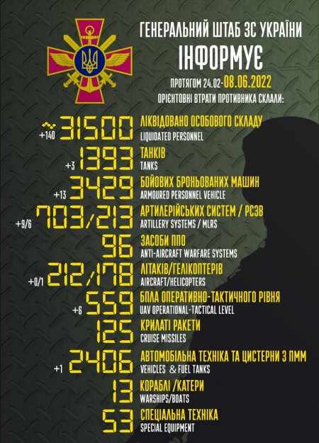 Загальні бойові втрати російських окупантів з 24 лютого по 8 червня орієнтовно склали: