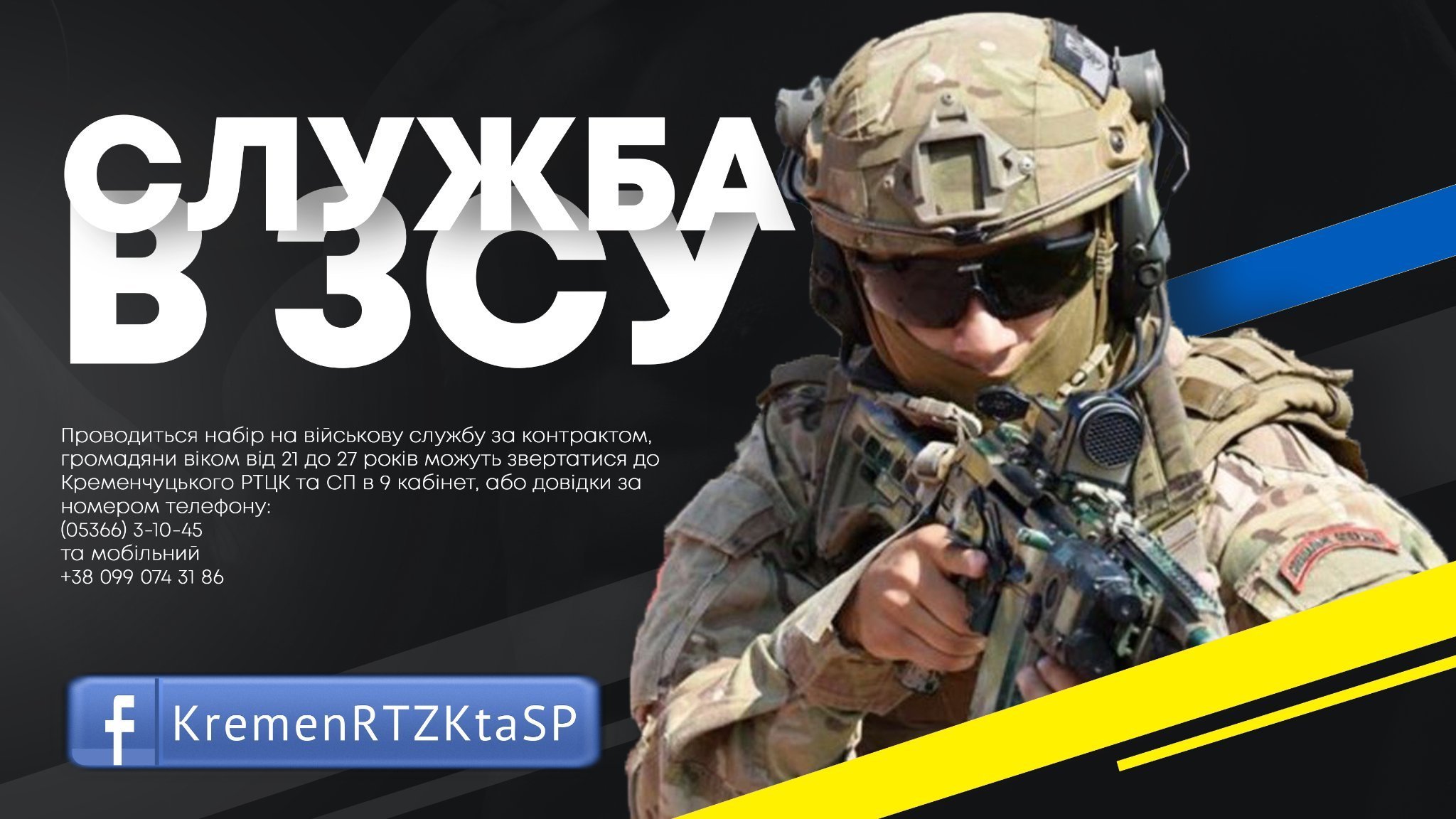 Проводиться набір на військову службу за контрактом, громадян віком від 21 до 27 років. Про це інформує пресслужба Кременчуцького районного ТЦК та СП.