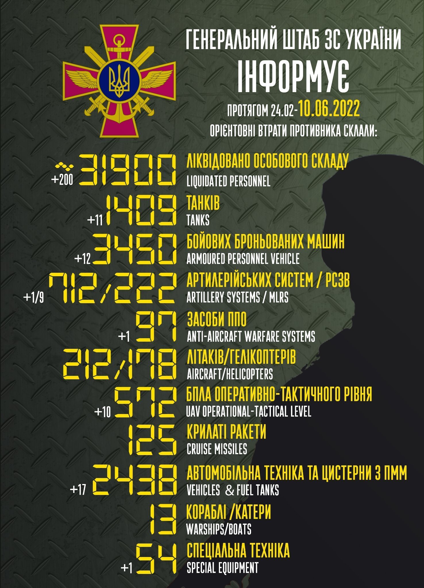 Генштабі ЗСУ повідомляє про втрати ворога по особовому складу, техніці та озброєнню за період з 24 лютого по 10 червня: