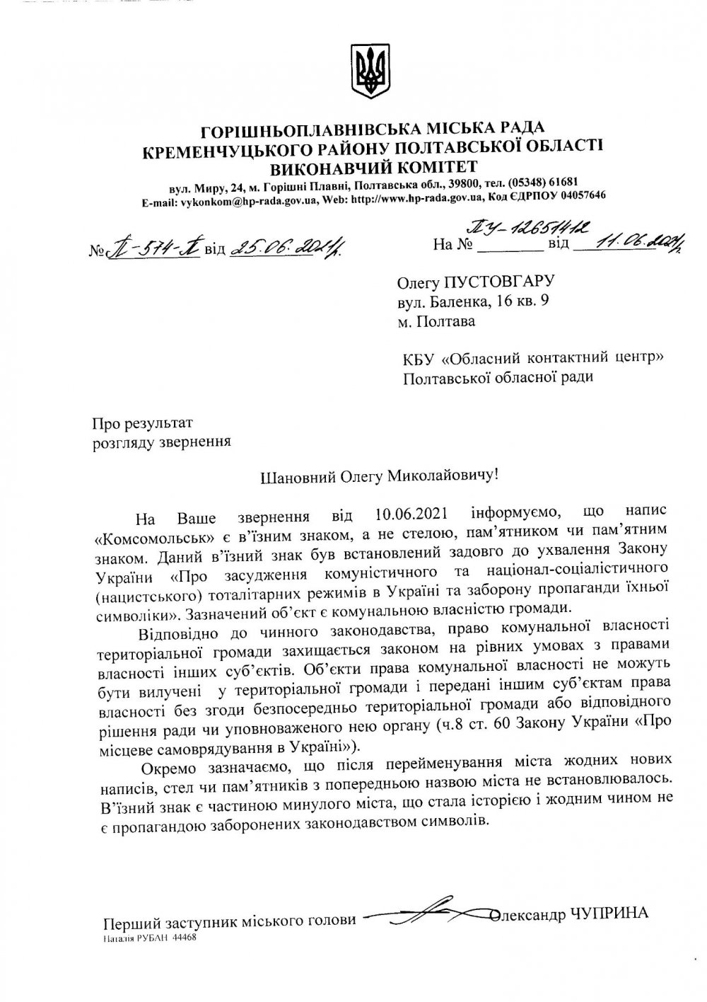 Влада Горішніх Плавнів вирішила не демонтувати в'їзні знаки до міста з написом «Комсомольск», бо на них розмістили патріотичні гасла. Полтавський офіс Українського інституту національної пам’яті звернувся до міської влади щодо необхідності демонтажу незаконних знаків «Комсомольськ» на в’їздах до Горішніх Плавнів, але отримав відмову.