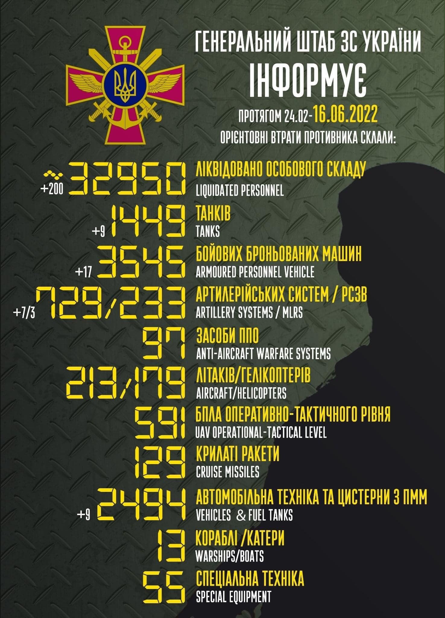 особового складу – близько 32950 (+200) ліквідовано;