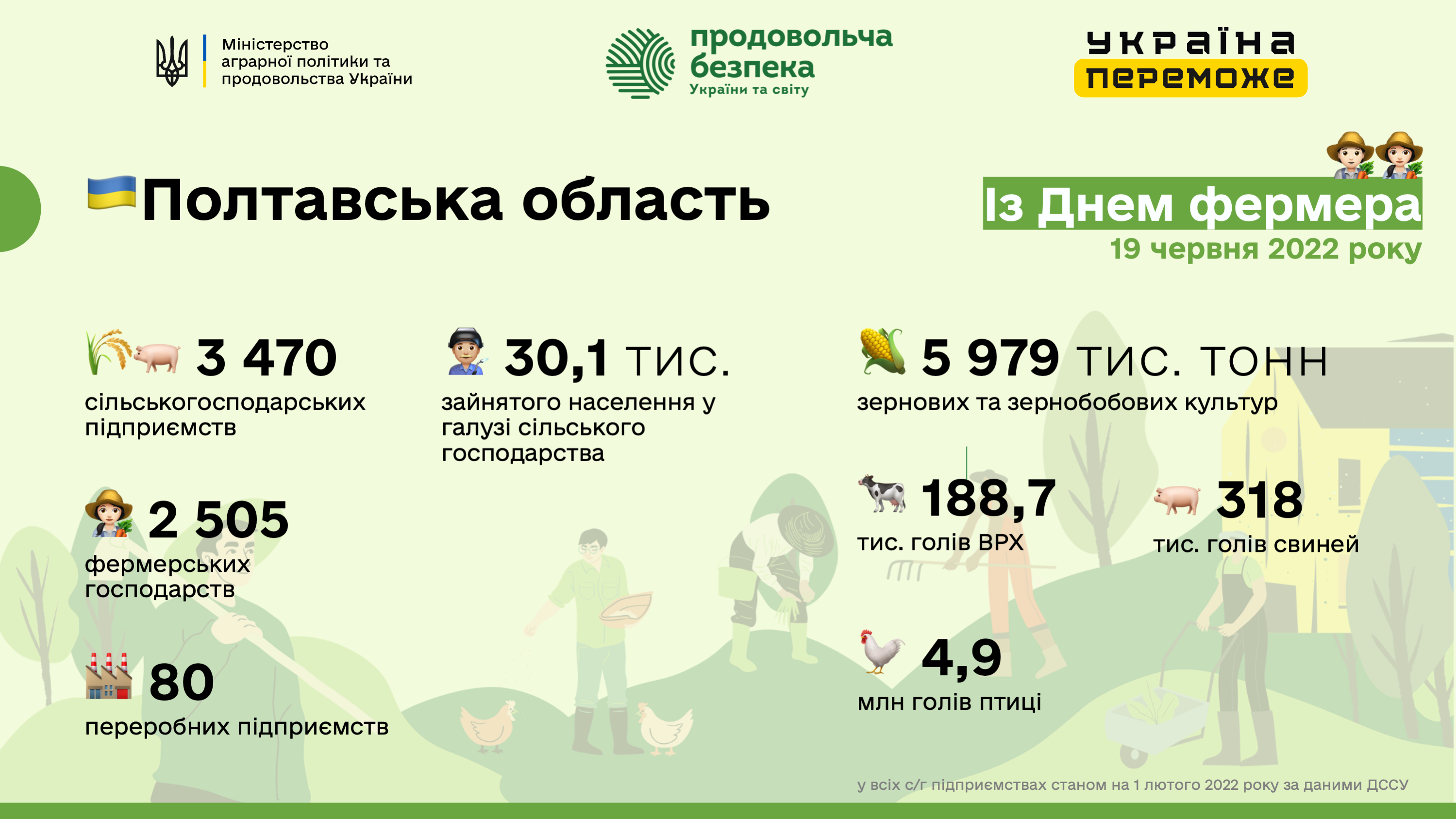 За даними міністерства, на Полтавщині працює 3 тис 470 сільгосппідприємств, 2 тис 505 фермерських господарств та 80 переробних підприємств.