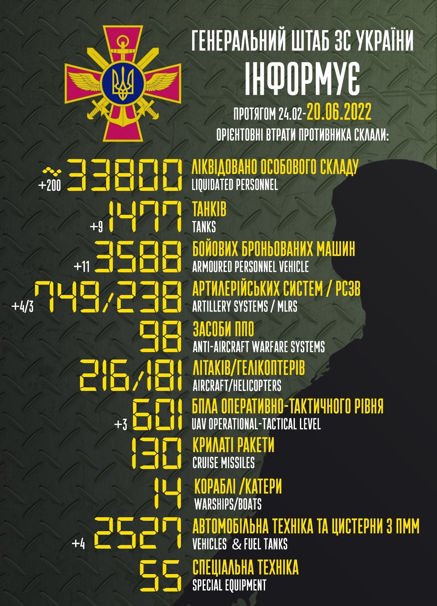 Станом на ранок 20 червня росія втратила у повномасштабній війні проти України приблизно 33 800 своїх військових. З них 200 — за останню добу.