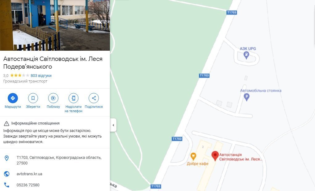 Користувачі додатку Google-карти помітили дивні зміни. Автостанцію у Світловодську перейменували на честь українського художника, представника Нової хвилі, автора сатиричних п’єс Леся Подерв’янського.
