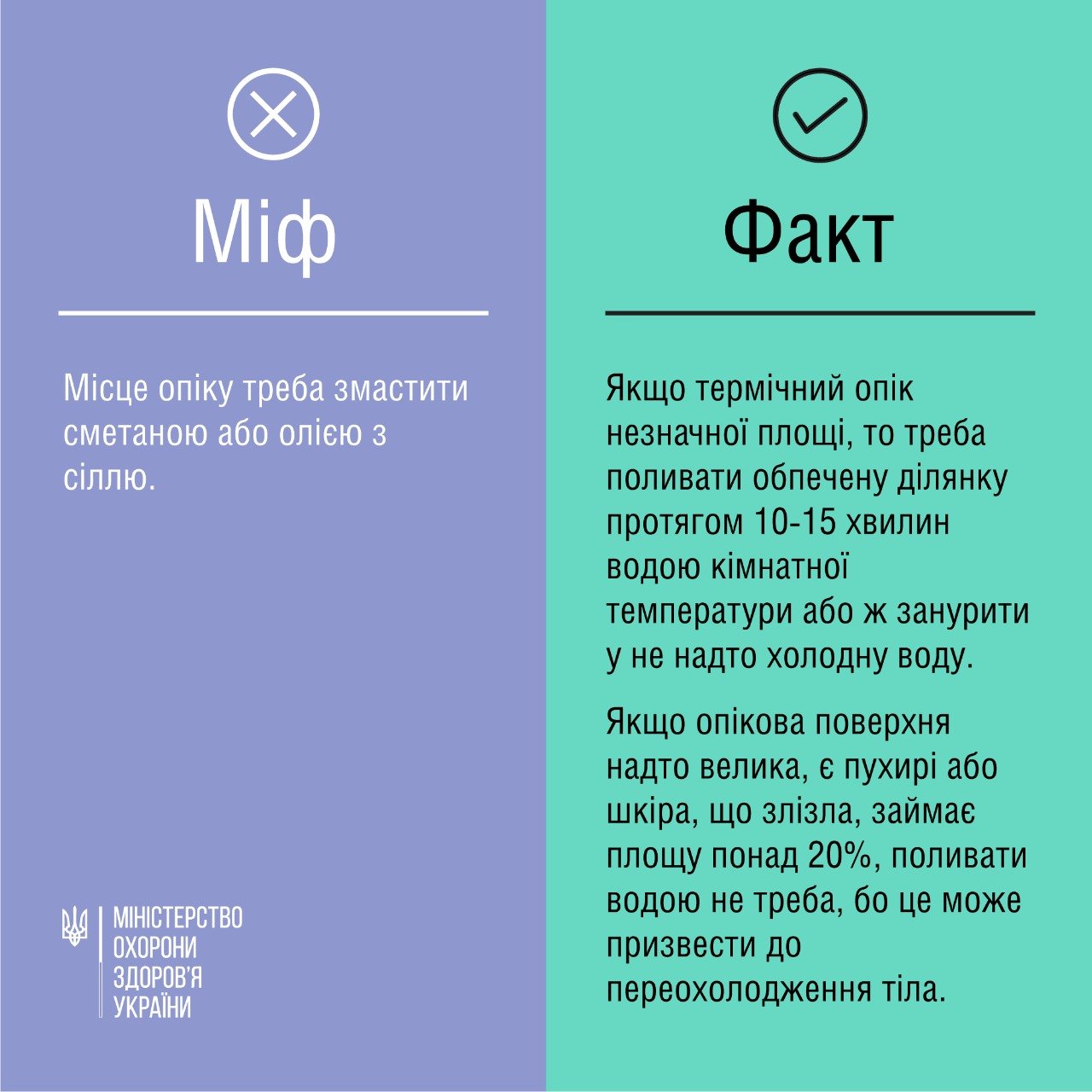 Правда. Якщо термічний опік незначної площі, то треба поливати обпечену ділянку протягом 10-15 хвилин водою кімнатної температури або ж занурити у не надто холодну воду.