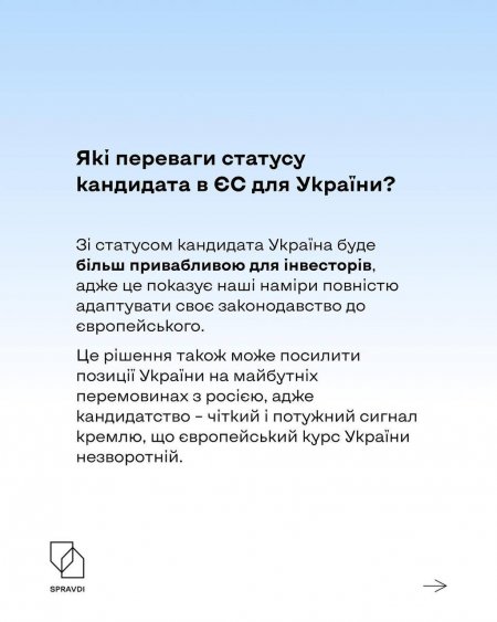 Рішення щодо надання Україні статусу країни-кандидата на входження до ЄС, яке глави держав та урядів Європейського Союзу ухвалили учора ввечері, дає Україні додаткові можливості для впровадження реформ та інвестиційної привабливості.