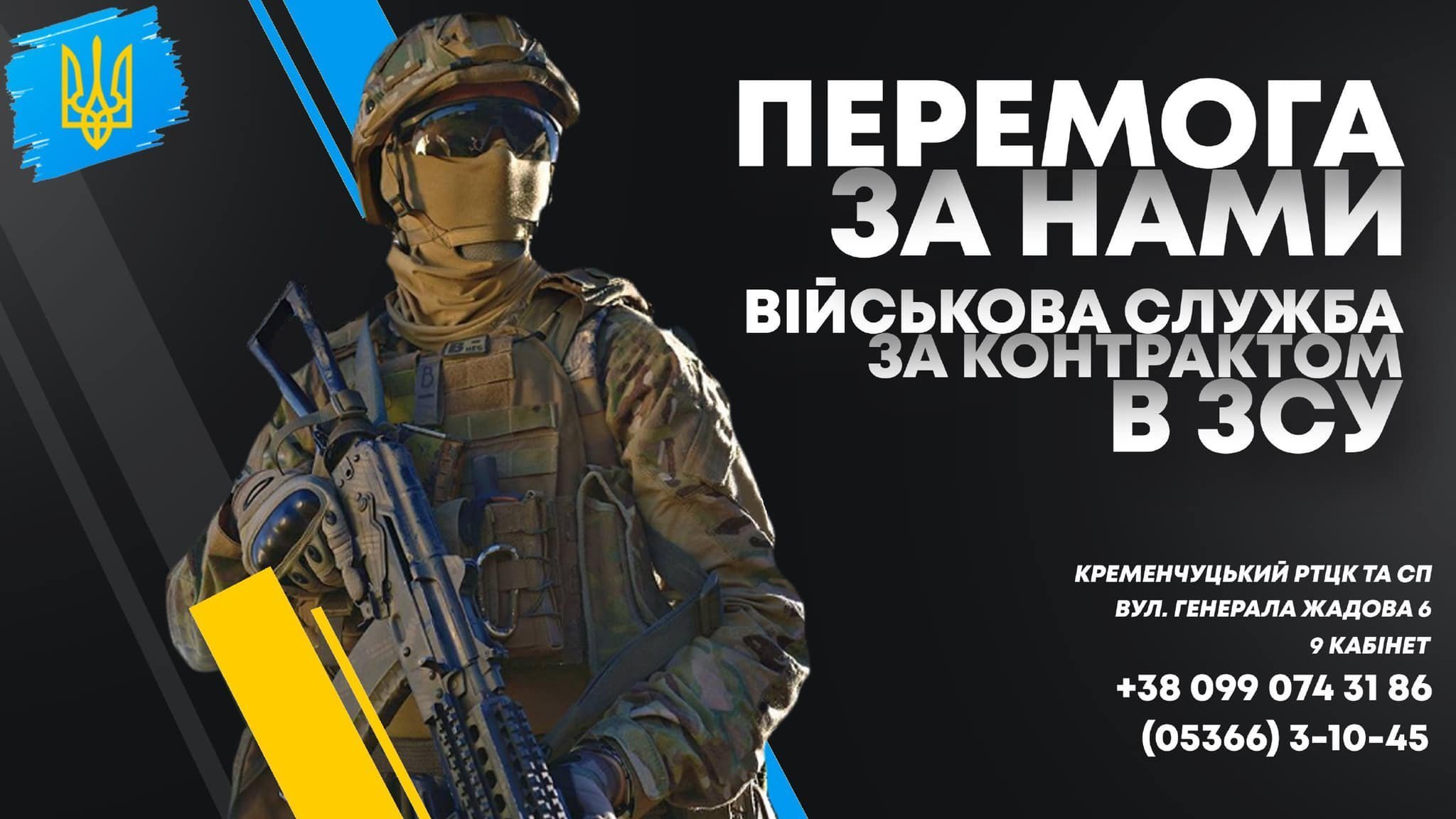 – Проводиться набір на військову службу за контрактом, громадяни віком від 21 до 56 років можуть звертатися до Кременчуцького РТЦК та СП в 9 кабінет, – йдеться у повідомленні.