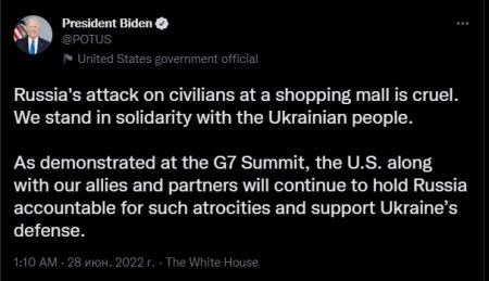 Президент Сполучених Штатів Джо Байден написав у Twitter: