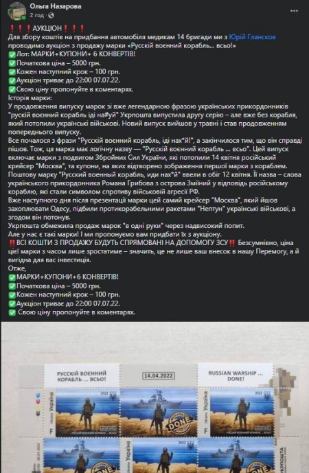Ще одна волонтерка з Кременчука Ольга Назарова для медиків 14 бригади разом з Юрієм Гласковим проводить аукціон з продажу «Русскій воєнний корабль… всьо!». Взяти участь можна на сторінці у фейсбуці за посиланням.
