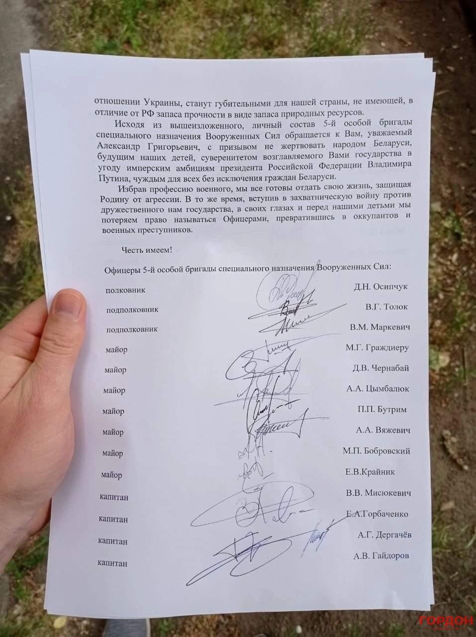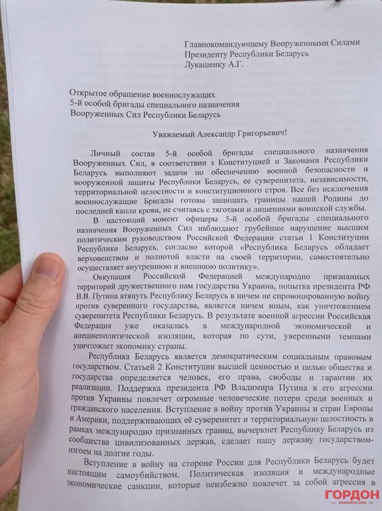 Військовослужбовці 5-ї особливої бригади спеціального призначення збройних сил Республіки Білорусь написали звернення до Олександра Лукашенка, який перебуває при владі в Білорусі. Про це написало видання «ГОРДОН» додавши фото листа, яке нібито видання отримало із власних джерел.