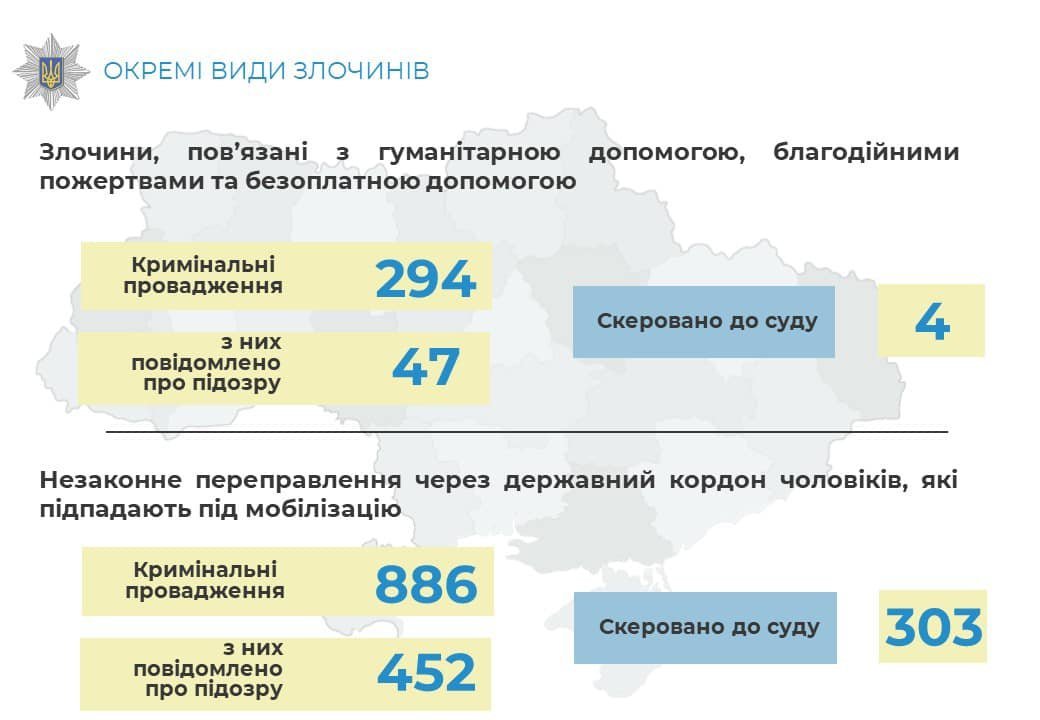 - Зареєструвала понад 290 кримінальних проваджень за розкрадання гуманітарної допомоги та благодійних пожертв. 47 осіб отримали повідомлення про підозру за скоєння цих злочинів.