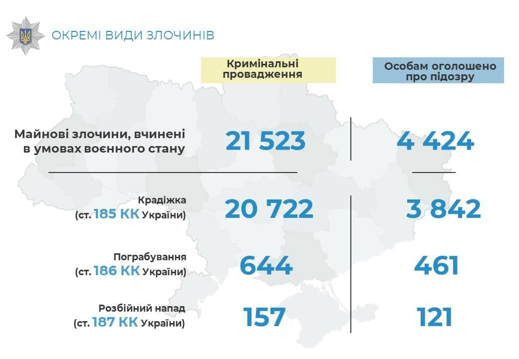 - Зафіксувала більше 21,5 тисячу майнових злочинів, з яких понад 20,7 тисяч – крадіжки. Більш як 4,4 тисячі підозрюваних осіб встановлено.
