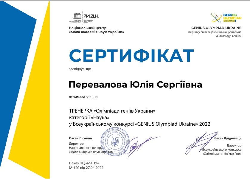 Юлія Перевалова, вчитель фізики, була науковим керівником хлопця і отримала звання «Тренерка «Олімпіади геніїв України» категорії «Наука» у Всеукраїнському конкурсі «GENIUS Olympiad Ukraine» 2022 та сертифікат Національного центру «Мала академія наук України».