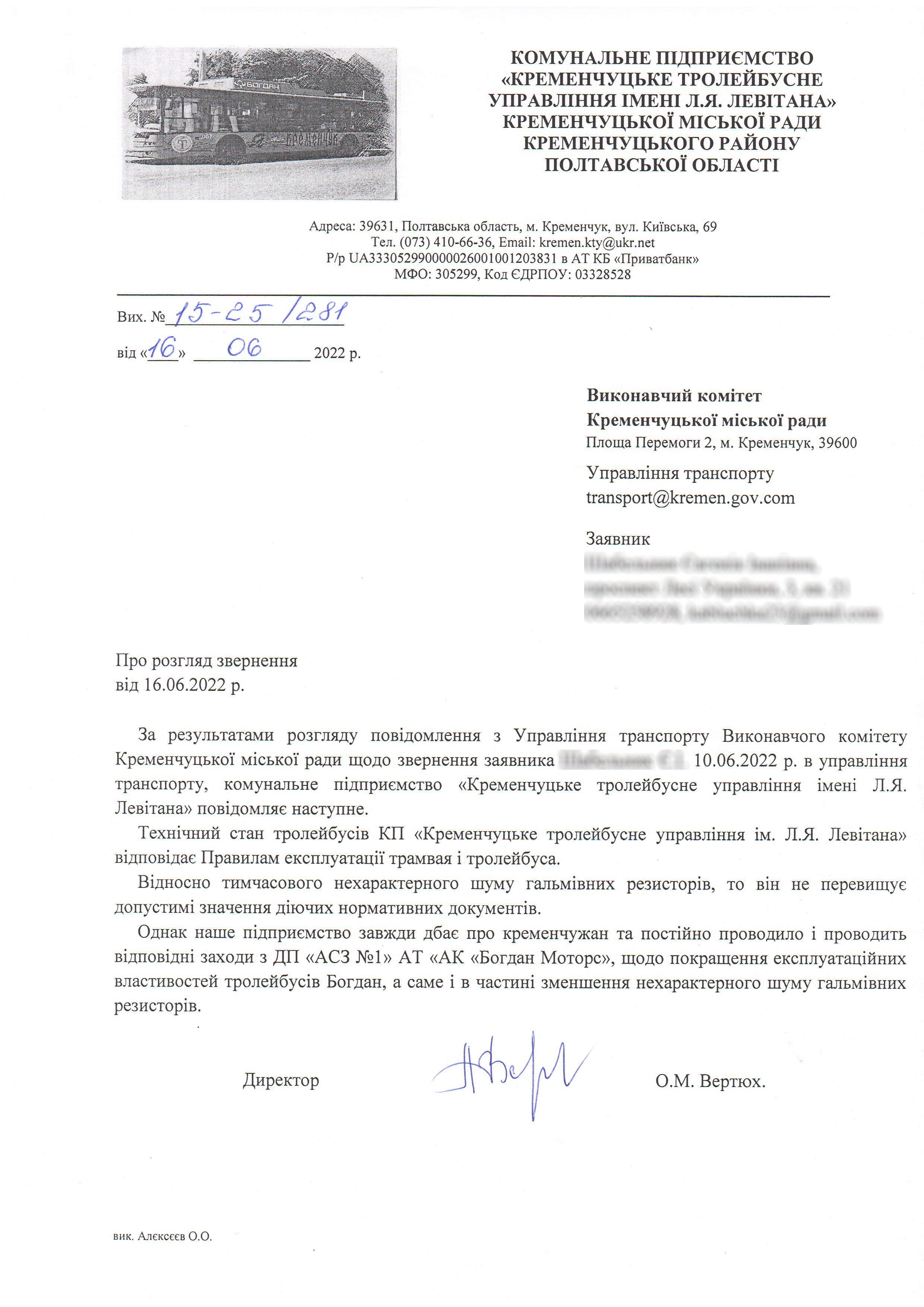 Євгенія звернулася до Кременчуцького тролейбусного управління зі скаргою щодо цього питання. А невдовзі отримала відповідь: