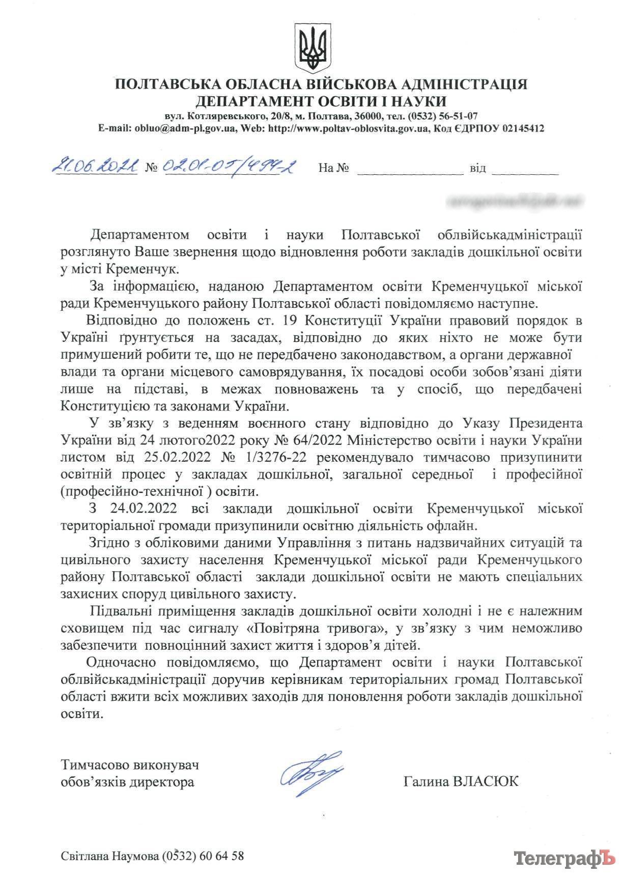 Також кременчужанка додала відповідь на її звернення до департаменту освіти нашого міста. Там, як і раніше, той факт, що дитячі садки не працюють, пояснюють відсутністю укриттів і холодними підвалами.