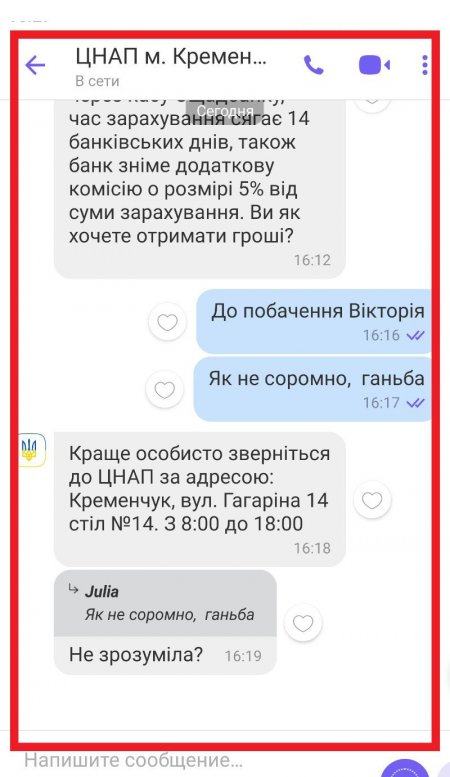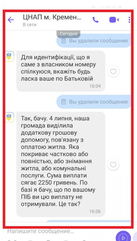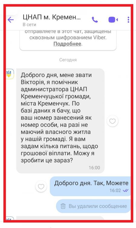До кол-центру Кременчуцького ЦНАПу надходять телефонні дзвінки стурбованих містян щодо опитування по вайберу серед відвідувачів установи. Як сповістила мерія, при цьому невідомі особи просять повідомити конфіденційну інформацію. Адресант може бути підписаний як «ЦНАП м. Кременчук. Вікторія».