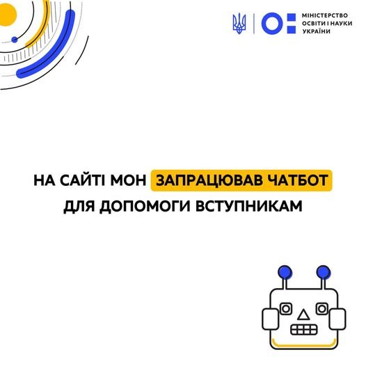 Від 18 липня 2022 року на сайті МОН https://mon.gov.ua/ua майбутні вступники можуть отримати відповіді на запитання щодо вступу до закладів фахової передвищої та вищої освіти. У співпраці з Урядовим контактним центром запрацював чатбот, що стане онлайн-помічником у питаннях вступної кампанії 2022 року.