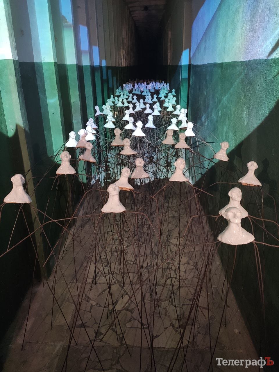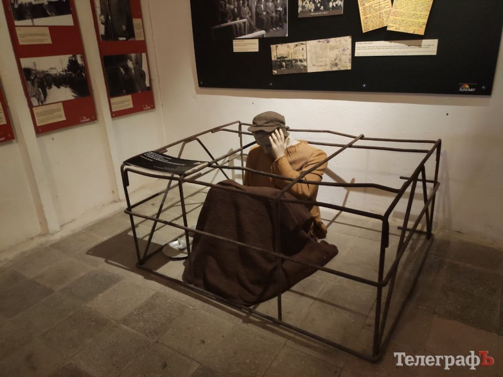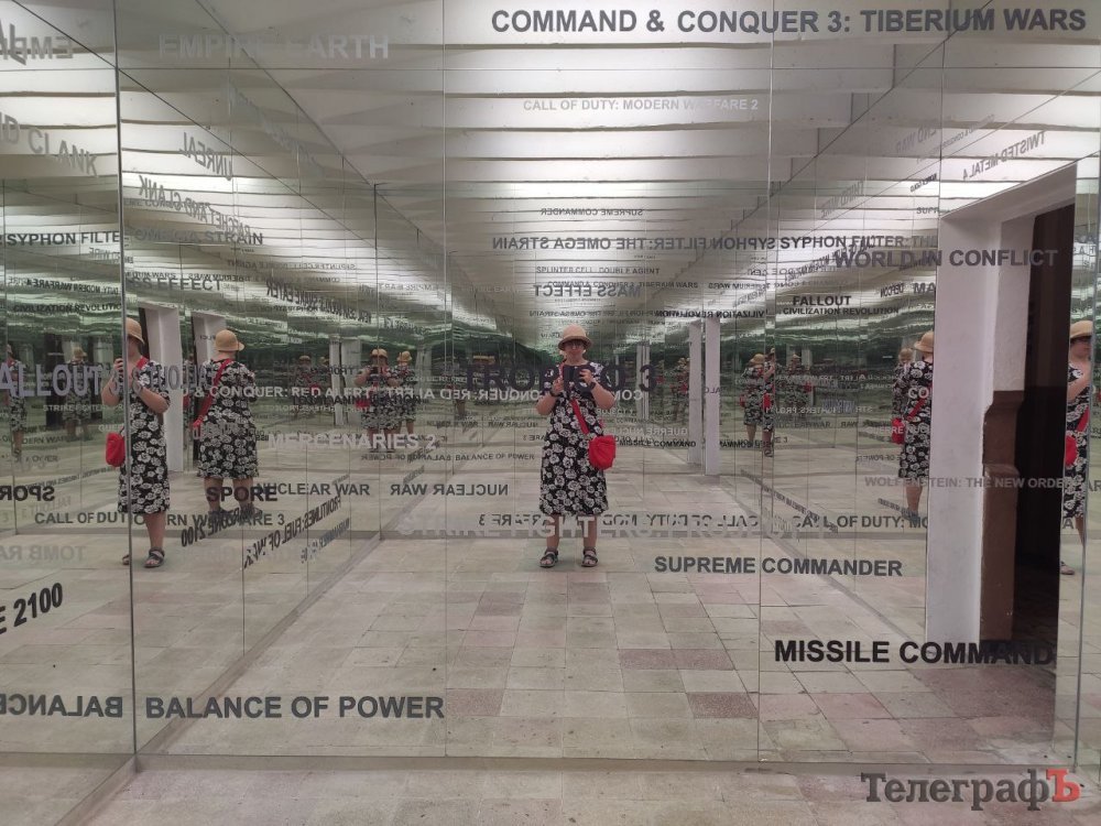 І всюди, за кожним кутком, можна побачити тематичні інсталяції. Людина, яка сидить у клітці, в розпачі тримаючись за голову. Безліч крихітних гіпсових бюстів, що вишикувались посеред коридору. Дзеркальна кімната, яка створює ілюзію безкінечного простору – а на дзеркалах назви комп’ютерних ігор, де йдеться про бункери і тоталітарні режими. Вікно, у яке сріляють ззовні – постріл, звук розбитого скла – і тиша, яка ще довго висить у повітрі.
