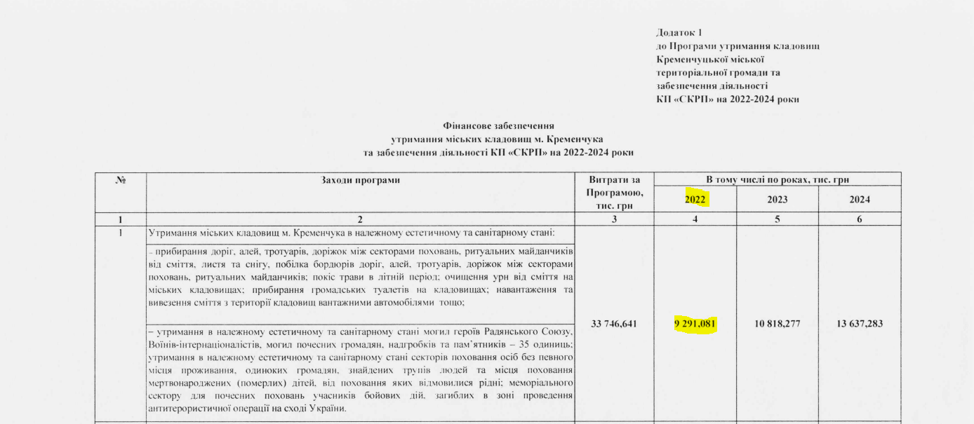 Зазначимо, що згідно з Програмою утримання кладовищ Кременчуцької громади на 2022-2024 роки на утримання міських цвинтарів у належному санітарному стані, у тому числі покіс трави, у 2022 році передбачено 9,2 млн гривень.
