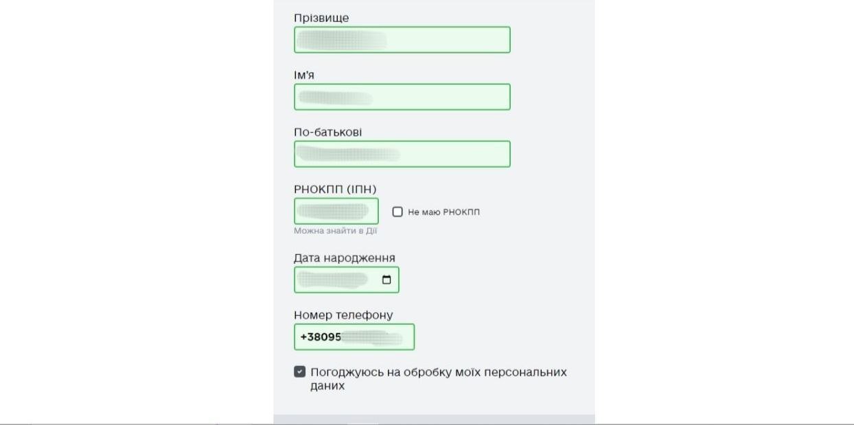 - Вкажіть ПІБ, ІПН, дату народження та номер телефону: