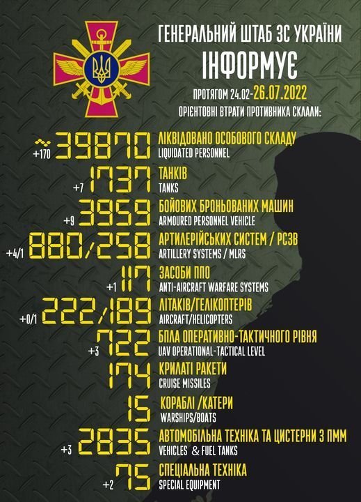 Нагадаємо, за інформацією Генерального штабу ЗСУ загальні бойові втрати ворога з 24 лютого по 26 липня склали майже 40 тисяч загиблих. Про кількість поранених окупантів Генштаб не повідомляє, але їх у 3-4 рази більше.