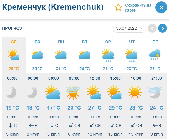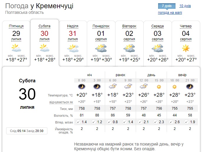 Gismeteo прогнозує на вихідних спеку – повітря прогріється від +17°С до +30°С. За даними цього сайту, і у суботу, і у неділю сонце майже не ховатиметься за хмарами, а отже палитиме Кременчук.