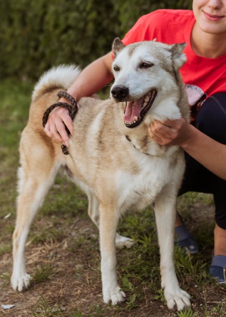 Приблизний вік собаки — 4 роки, стерилізована. Спокійна, розумна, лагідна, витончена і має харизматичний хвостик-бублик.