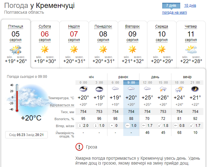 Вдень 5 серпня по Полтавській області, зокрема у Кременчуці, очікуються грози. Про це повідомляє Полтавський обласний центр з гідрометеорології. Оголошений перший рівень небезпечності – жовтий.