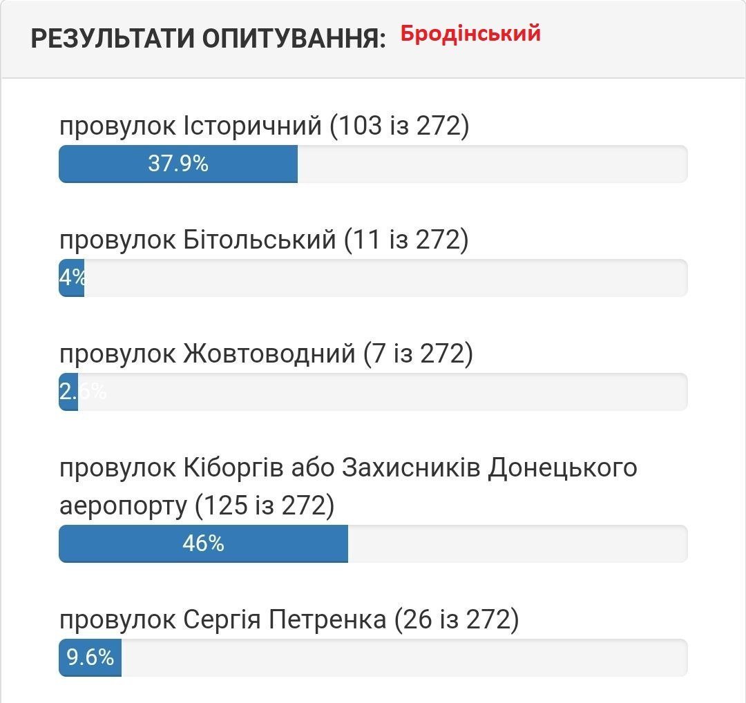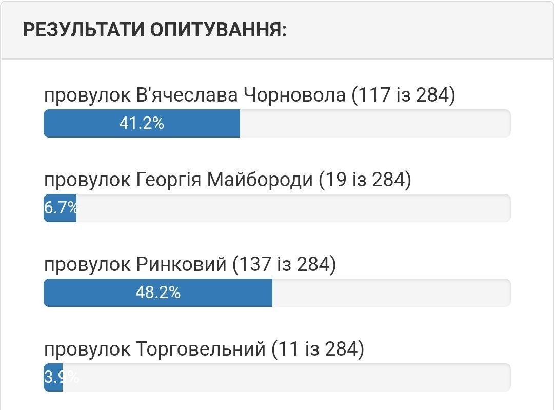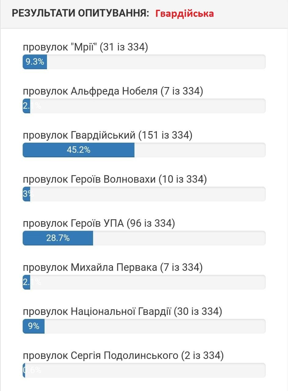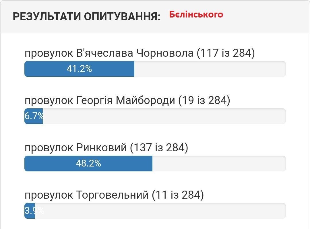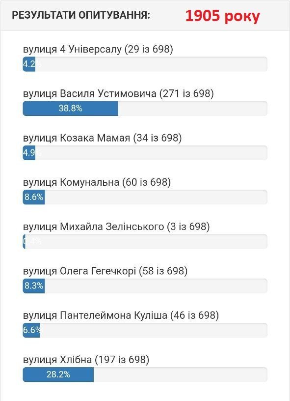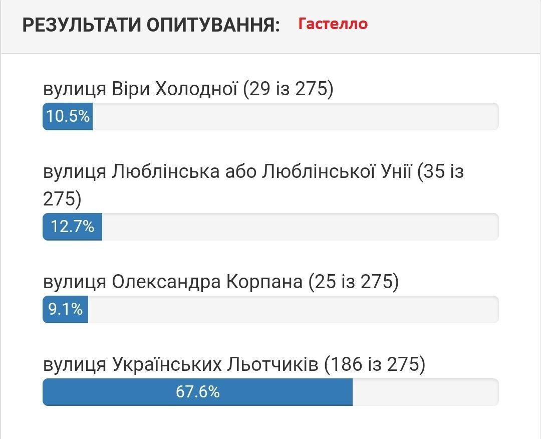 Станом на 5 серпня вподобання містян виглядають наступним чином. Якщо на вулиці 1905 року на початку лідирувала вулиці Хлібна, то зараз більшістю голосів лідирує вулиця Устимовича. Вулицю Гвардійську хочуть перейменувати на вулицю Гвардійську! Змінив лише значення нової/старої назви вулиці.