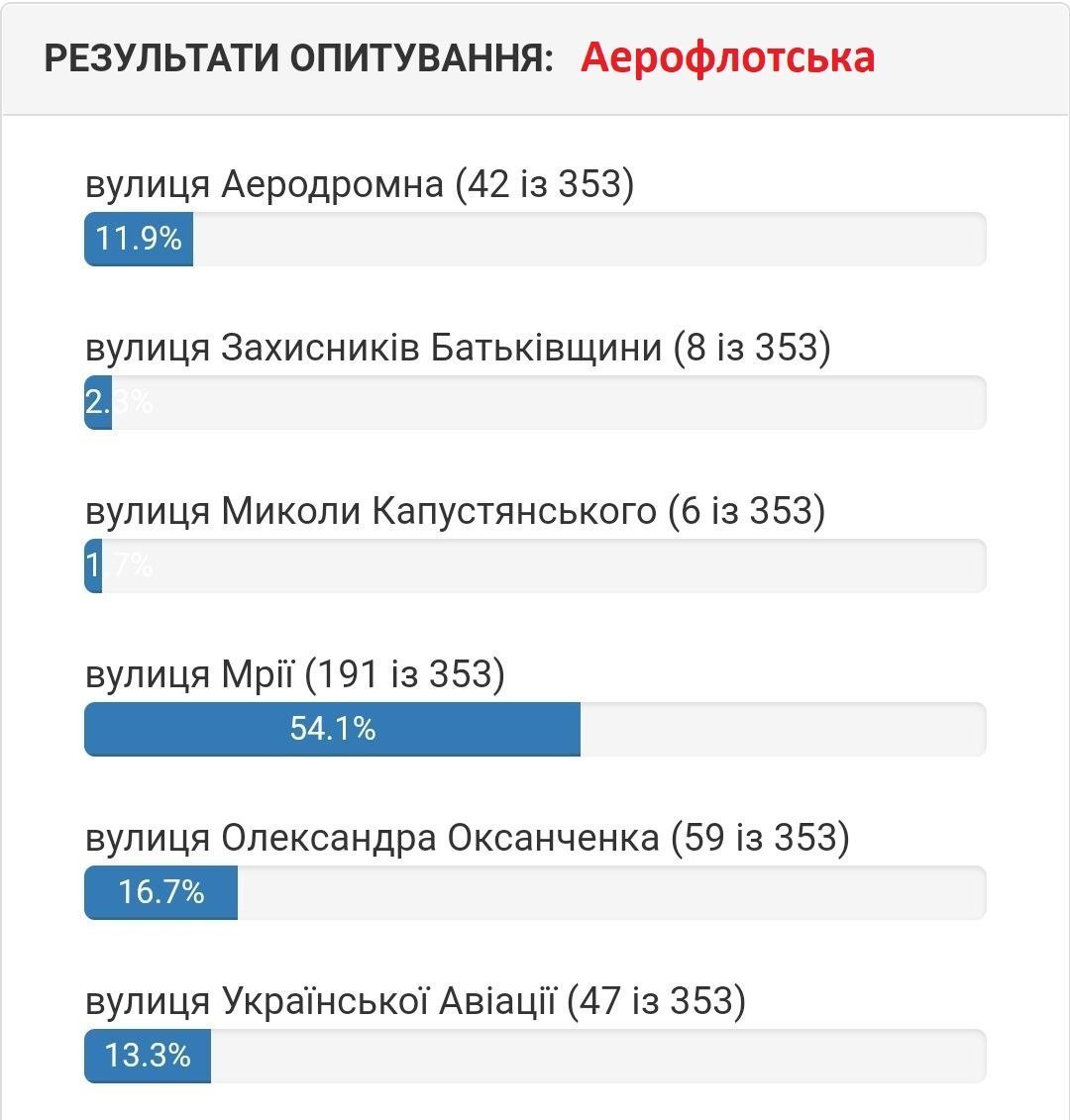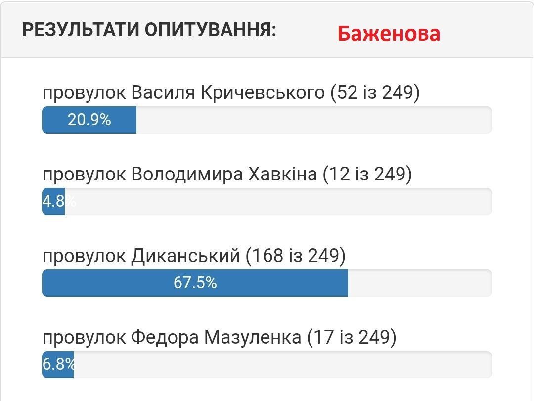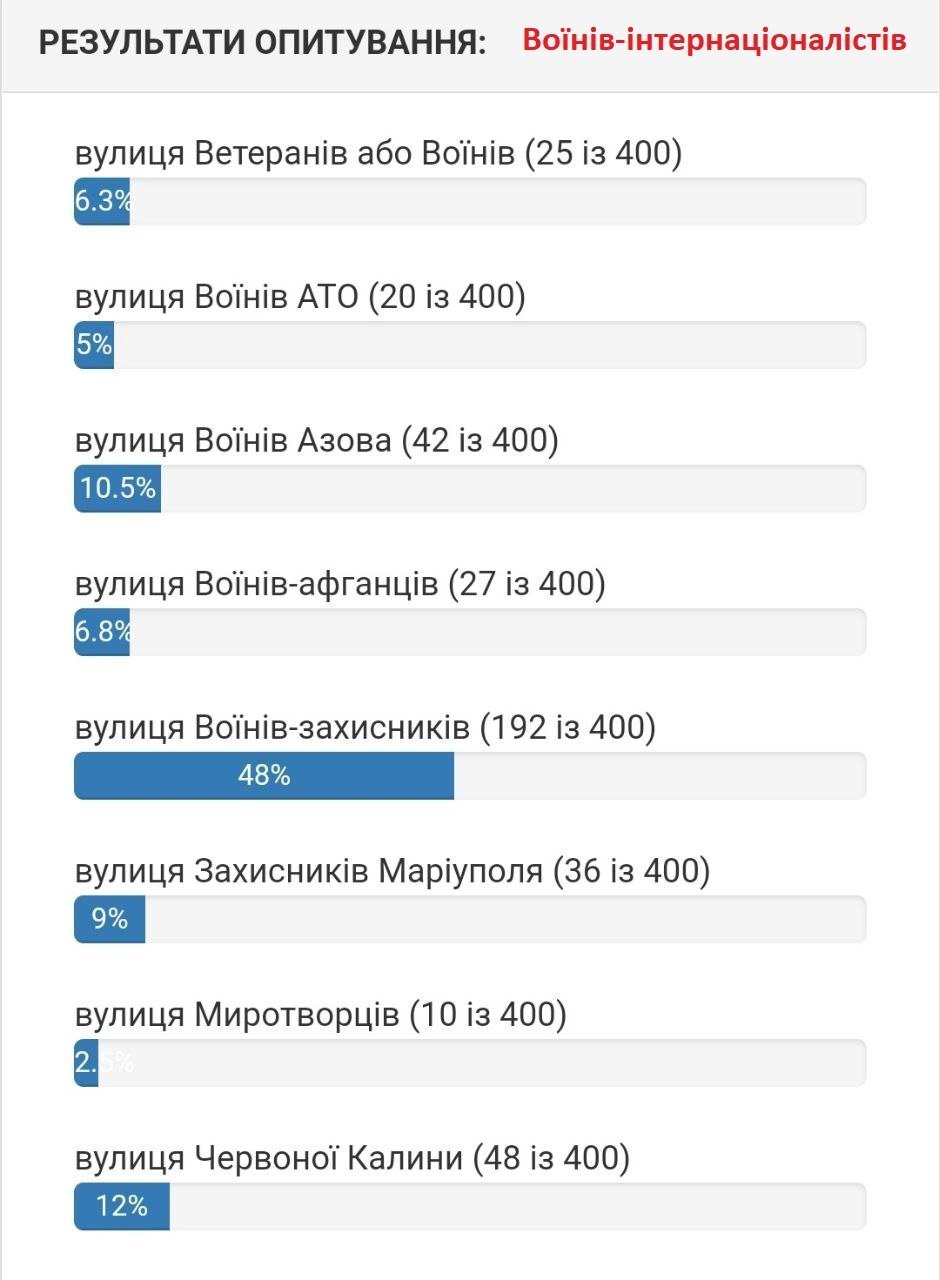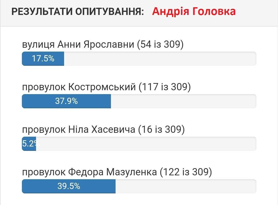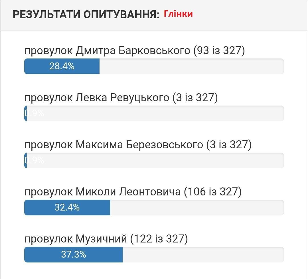 Станом на 5 серпня вподобання містян виглядають наступним чином. Якщо на вулиці 1905 року на початку лідирувала вулиці Хлібна, то зараз більшістю голосів лідирує вулиця Устимовича. Вулицю Гвардійську хочуть перейменувати на вулицю Гвардійську! Змінив лише значення нової/старої назви вулиці.