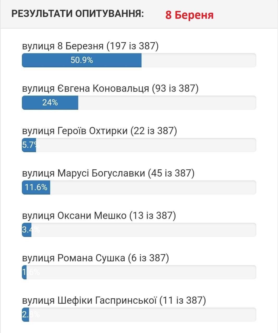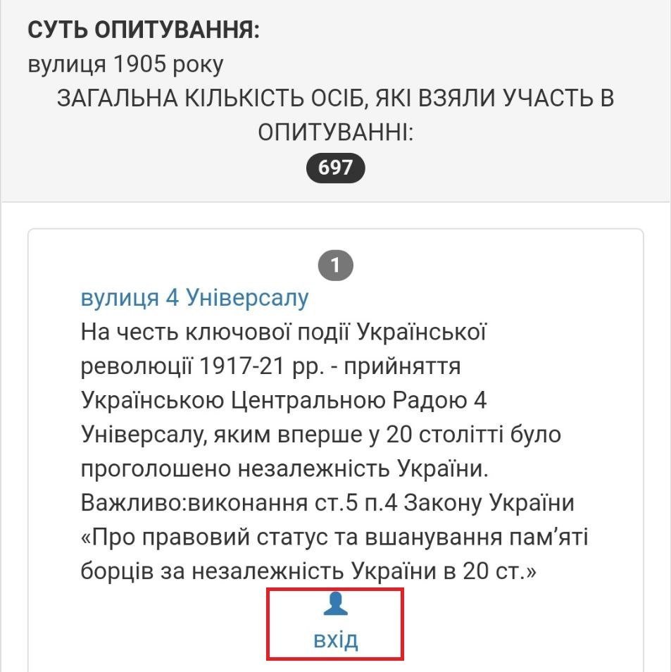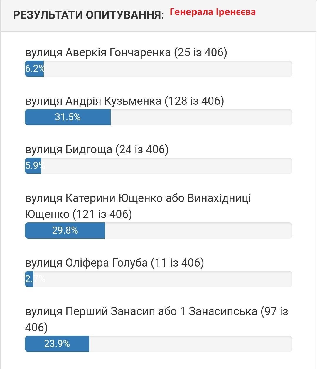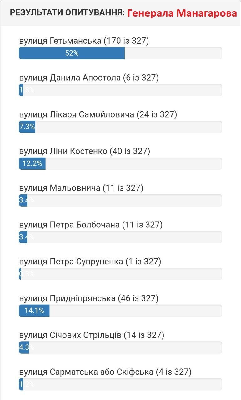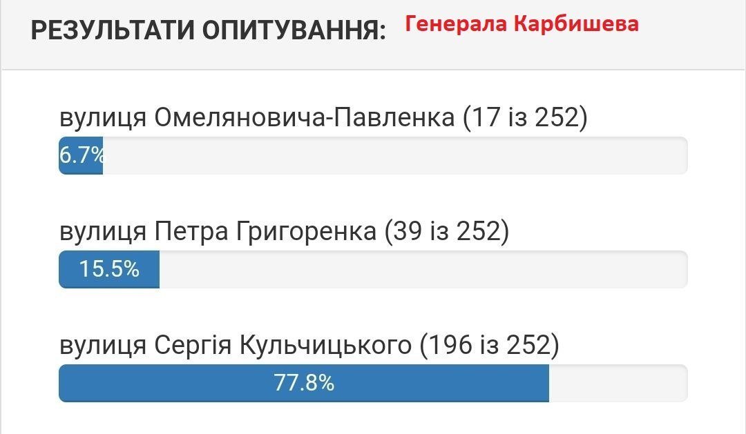 Станом на 5 серпня вподобання містян виглядають наступним чином. Якщо на вулиці 1905 року на початку лідирувала вулиці Хлібна, то зараз більшістю голосів лідирує вулиця Устимовича. Вулицю Гвардійську хочуть перейменувати на вулицю Гвардійську! Змінив лише значення нової/старої назви вулиці.
