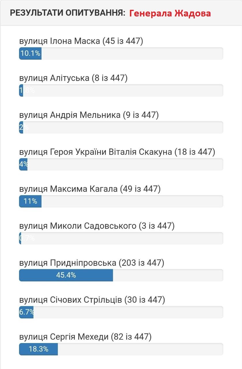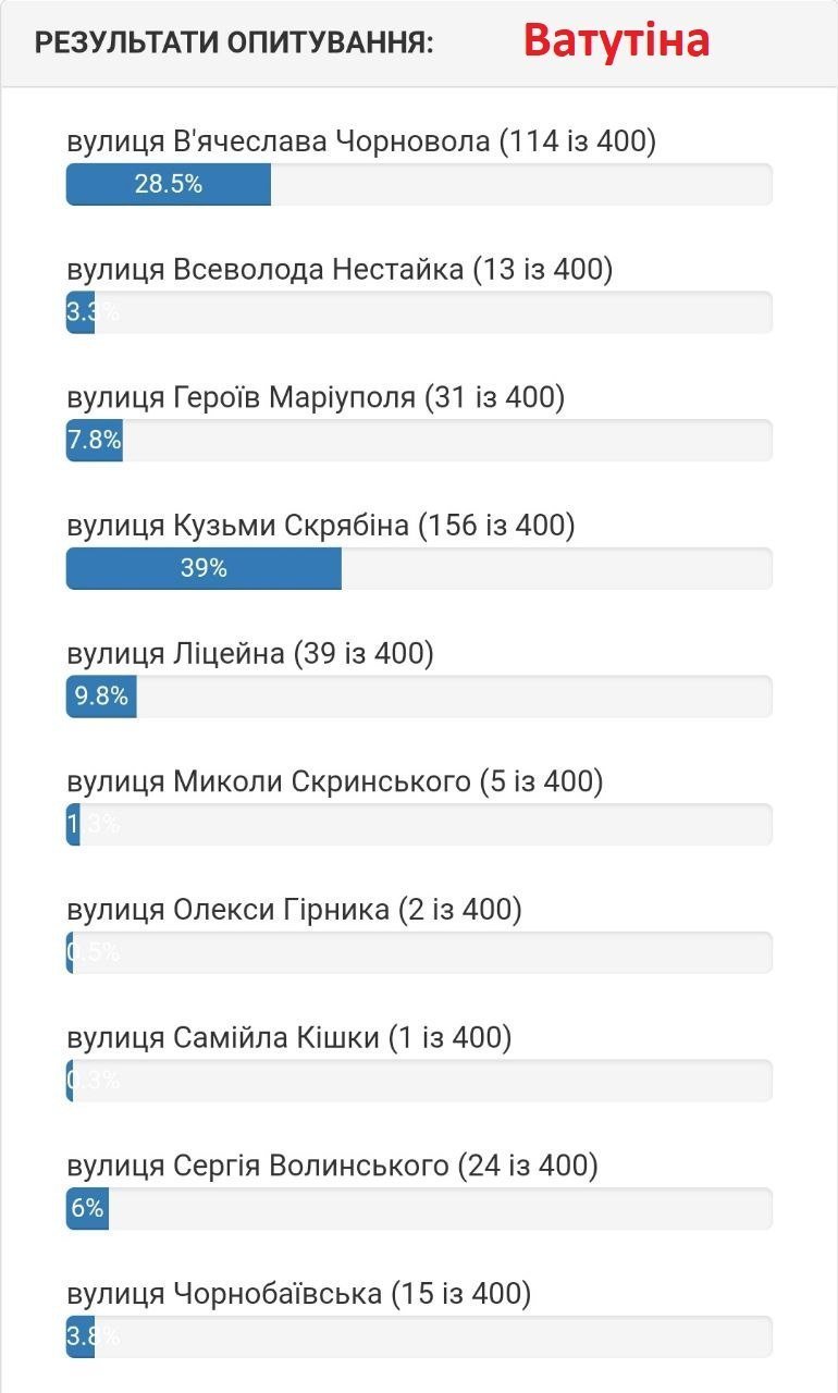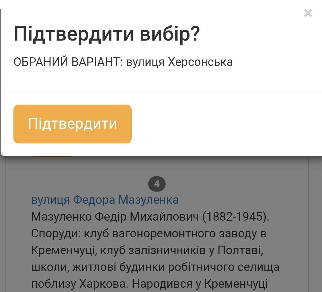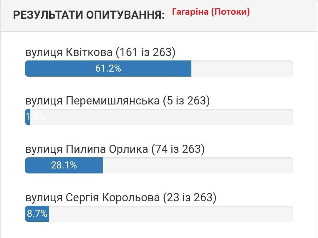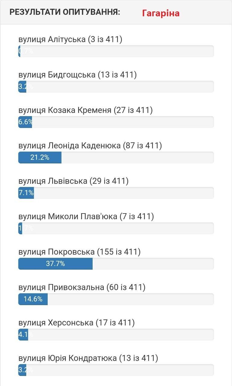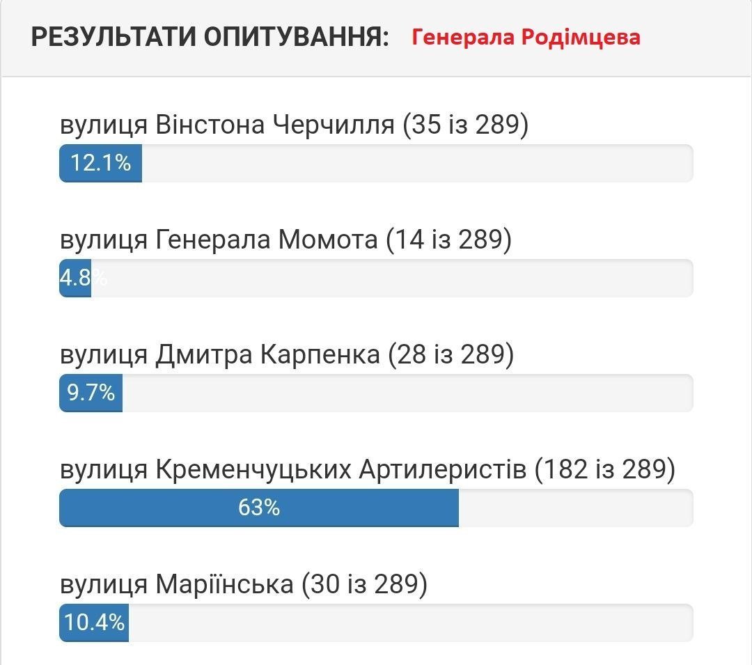 За понад два тижні голосування кременчужани віддали 10 677 голосів обираючи нові назви 30 вулицям Кременчука та Потоків. Серед пропозицій звучали імена живих людей, так наприклад люди пропонували перейменувати вулицю на честь Ілона Маска, Ліни Костенко та екс командира 36 бригади Сергія Волинського, який тимчасово перебуває у російському полоні.