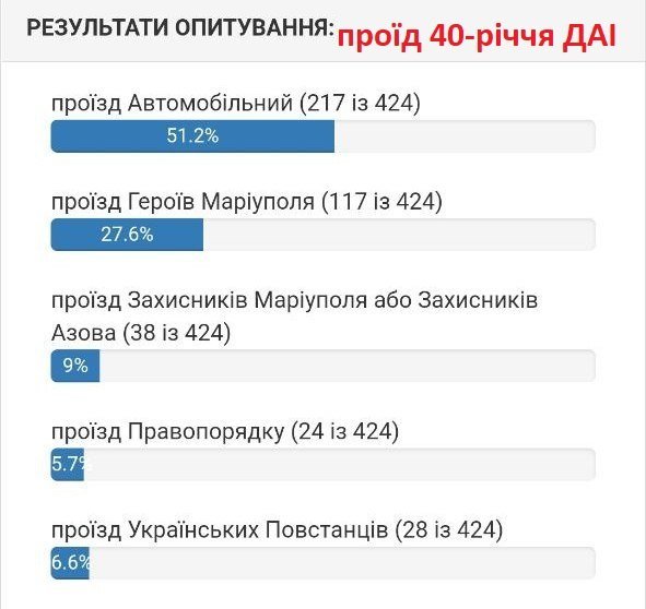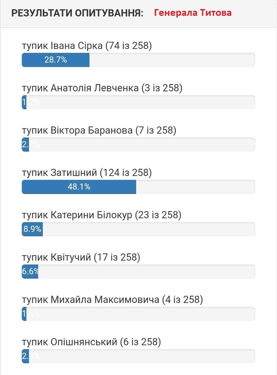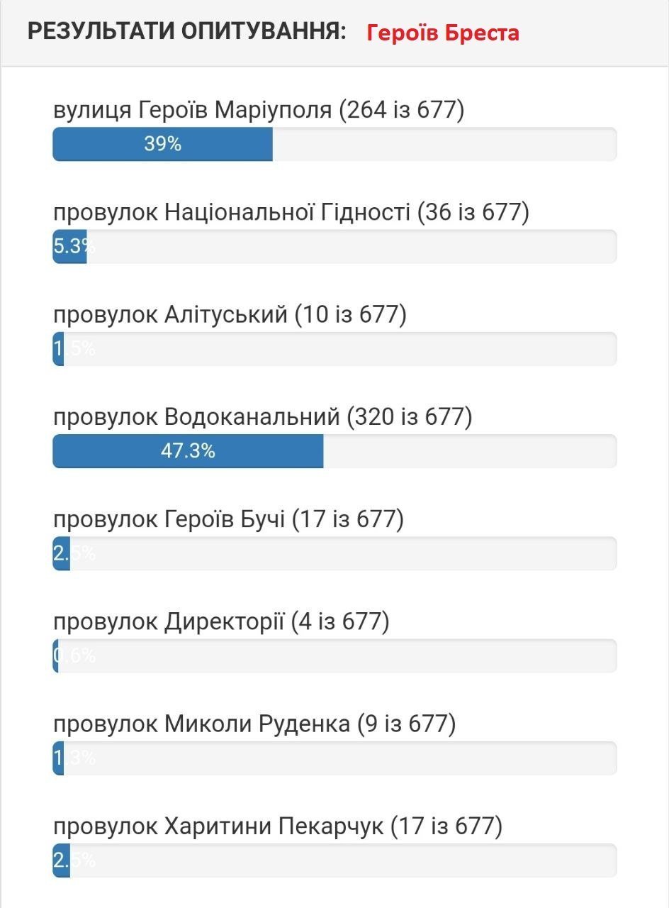 Йде запекла боротьба у голосування за перейменування вулиці Героїв Бреста. Там з невеликою різницею перемагає вулиці Водоканальська, хоча не відстає вулиця на честь Маріуполя.