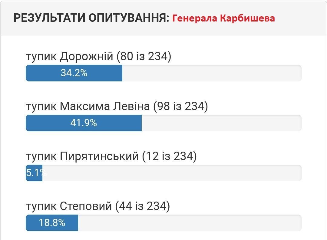У голосуванні за перейменування тупика Генерала Карбишева лідирує тупик імені Максима Левіна – українського фотографа, якого вбили росіяни. Саме його фото Кременчуцький Телеграф використовував у своїх публікаціях на початку повномасштабної російсько-української війни.