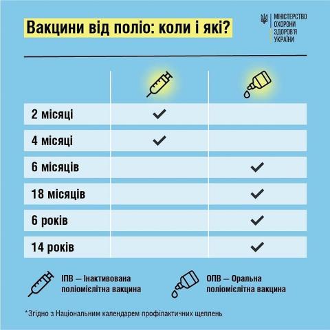 В Україні щеплення від поліомієліту входять у перелік обов’язкових і гарантованих державою. Їх роблять безкоштовно у закладах надання первинної медичної допомоги. Дитина має отримати 6 доз вакцини: у 2, 4, 6, 18 місяців та 6 і 14 років.