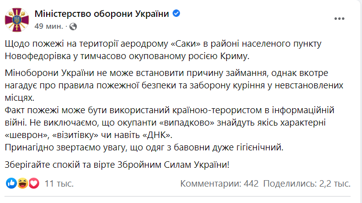 У Міноборони України прокоментували сьогоднішні вибухи в Криму. Кажуть, не можуть встановити причину займання. Проте нагадали про правила пожежної безпеки та заборону куріння у невстановлених місцях:).
