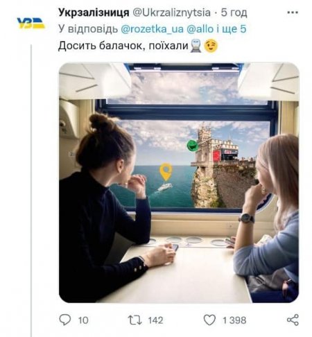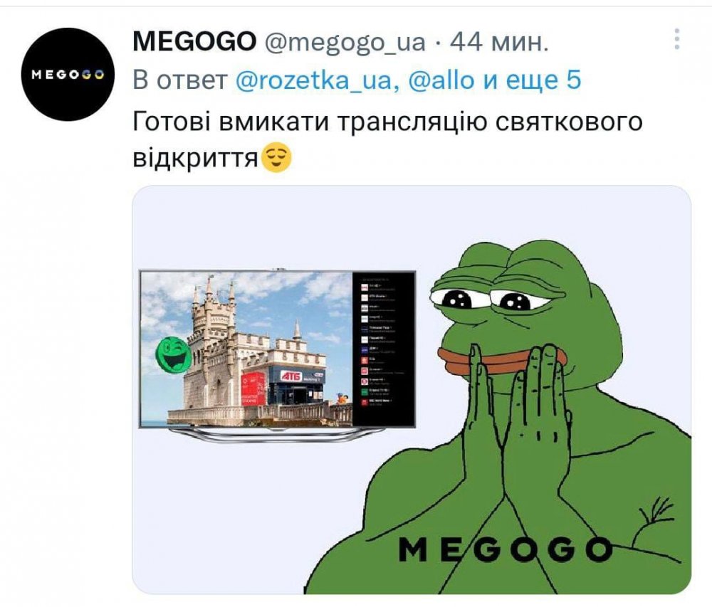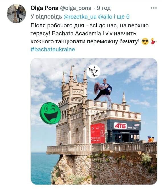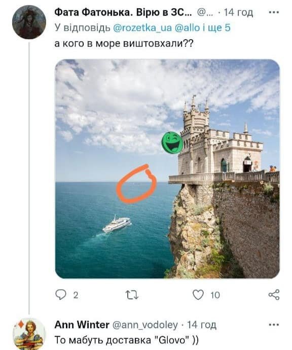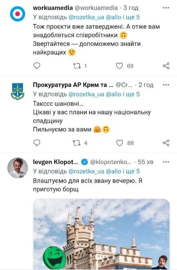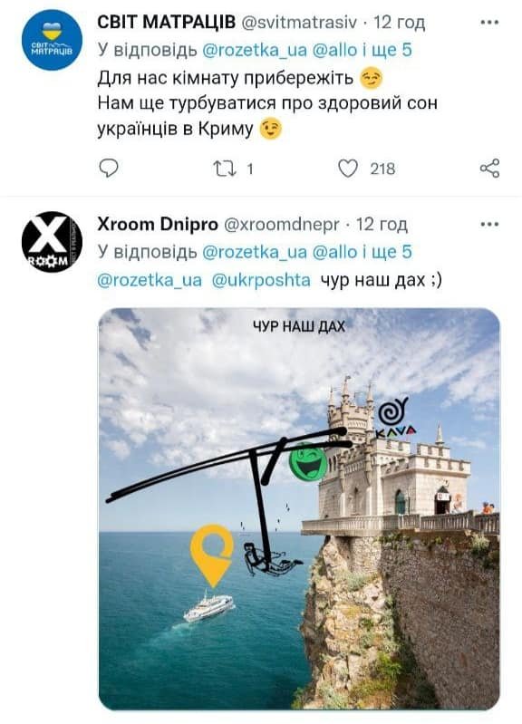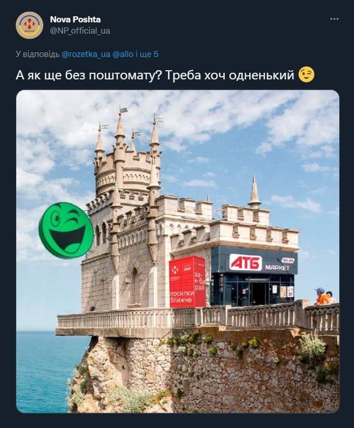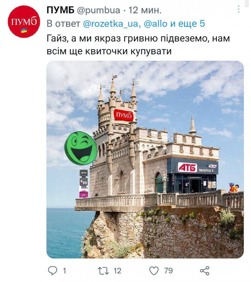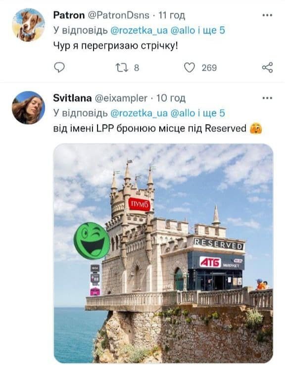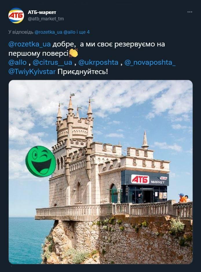 Все почалося з інтернет-магазину Rozetka. Компанія виклала в Twitter знімок «Ластівчиного гнізда» в Ялті, на якому зображено їх відділення.